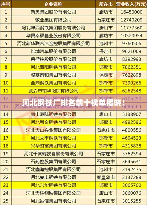 河北作为中国的重要钢铁生产省份,拥有众多的钢铁企业,在这篇文章中,我们将为您介绍河北钢铁厂排名前十名,这些企业在钢铁行业具有较高的知名度和影响力。