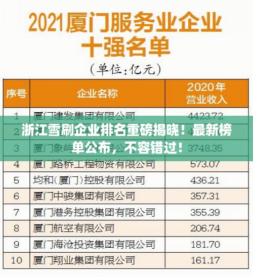 浙江省雪刷企业排名最新公布,引起行业内外的广泛关注,随着冬季的到来,雪刷行业迎来了发展的新阶段,浙江省内的雪刷企业在市场竞争中也展现出了各自的实力,本文将详细介绍浙江雪刷企业的排名情况,带您了解这些企业的优势和特点。